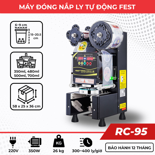 Máy dập cốc tự động FEST RC-95 có thiết kế nhỏ gọn, công suất lên tới 350W, phù hợp với ly nhựa/giấy cao 20,5cm; đường kính miệng ly 90mm. Được ưa chuộng sử dụng trong các nước giải khát, nhà hàng, quán ăn,...