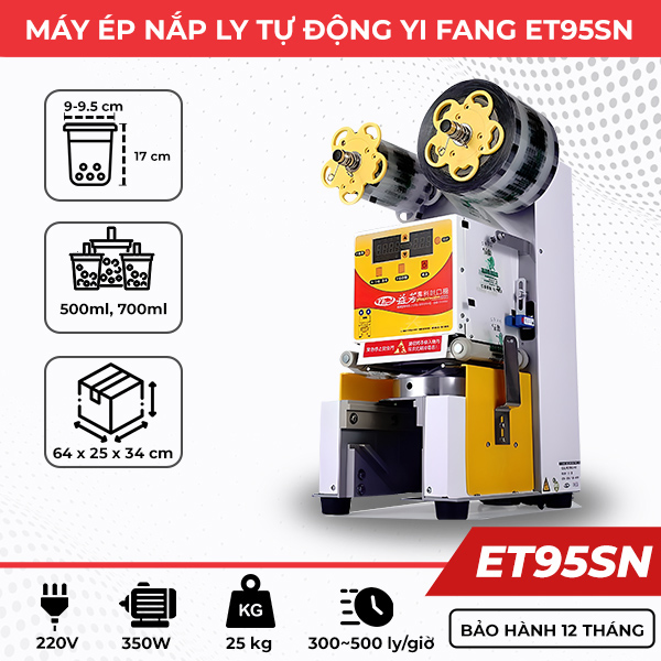 Máy dập cốc tự động Yifang ET95SN với thiết kế hiện đại, năng suất vượt trội từ 300-500 ly/h, phù hợp với các quán nước giải khát. Máy có thể ép ly có đường kính miệng 90-95mm, cao 17cm.
